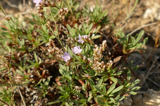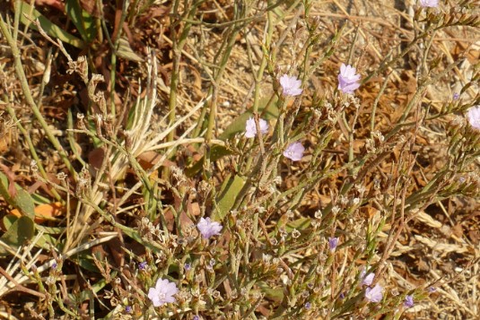 Limonium laetum: è un modesto arbusto, / erba con foglie lineari a spatola.Spighette terminali con numerosi fiori e calice leggermente peloso lungo le coste verticali. Vive su stagni salati e lo ritroviamo anche in territorio di Stintino.