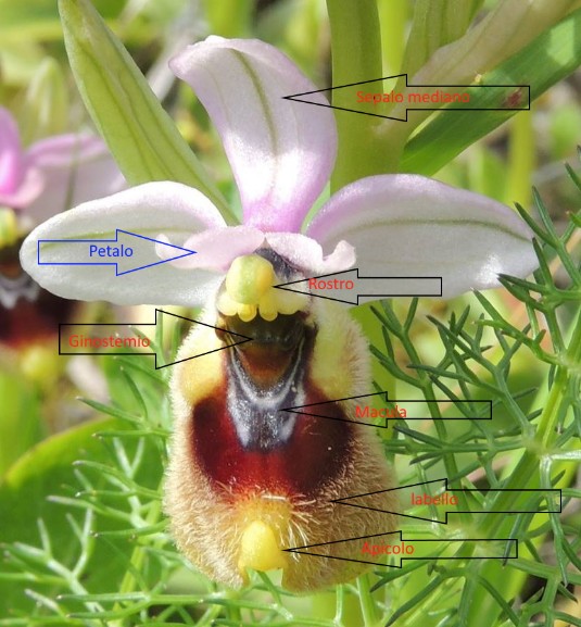 Altre differenze riguardano i 3 tepali esterni, detti sepali, dove il centrale è leggermente diverso dai due laterali, ed i tepali interni presentano quello centrale(labello),molto ingrandito, di colorazione diversa, adatto ad accogliere gli insetti per la impollinazione, quasi una pista di atterraggio.