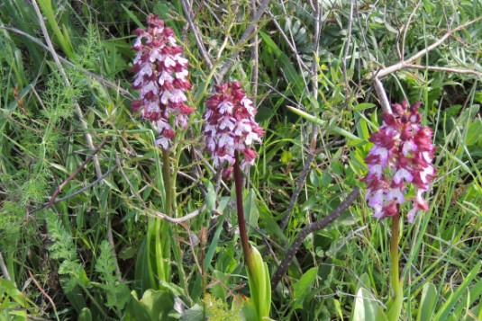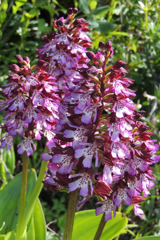 Il fusto della orchidea Orchis purpurea, è alto fino a 80 cm, è di colore verde tinteggiato color porpora con foglie basali molto lunghe e lanceolate. Numerosissimi i fiori, anche fino a 80-100 per pianta, con labelli bianchi ma punteggiati di rosa-porporino.