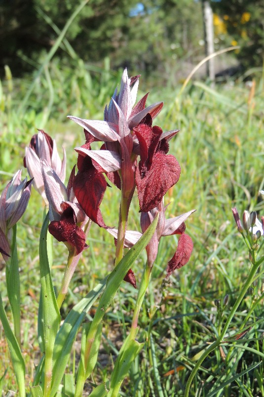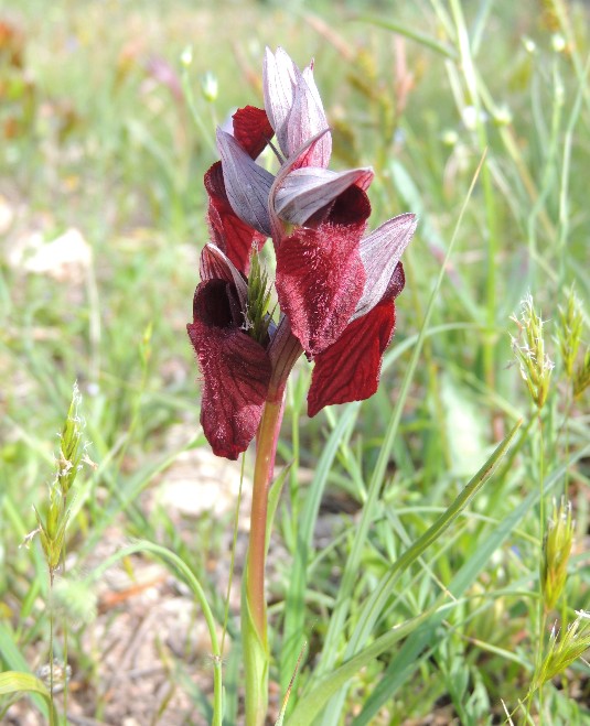 Piantina robusta, alta fino a 40 cm. , foglie prima lineari poi lanceolate.Labello lungo da 33 a 45 cm tappezzato da peli rossastri o scuri con evidenziate venature ancora più scure. Numerosi i fiori nello stesso stelo. Cresce su prati magri , sulle pinete litoranee, e su suoli più spesso silicei. Fioritura da aprile a maggio