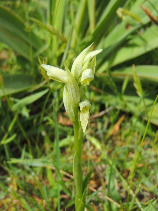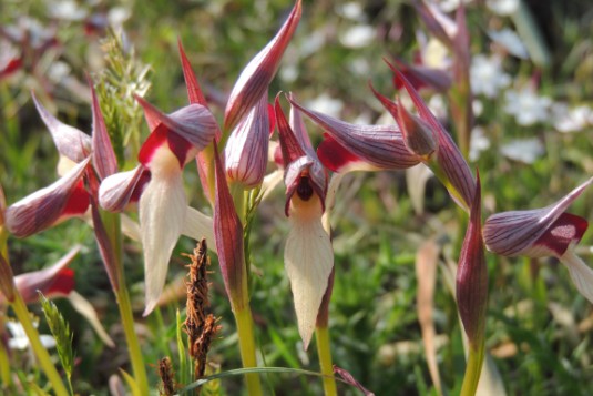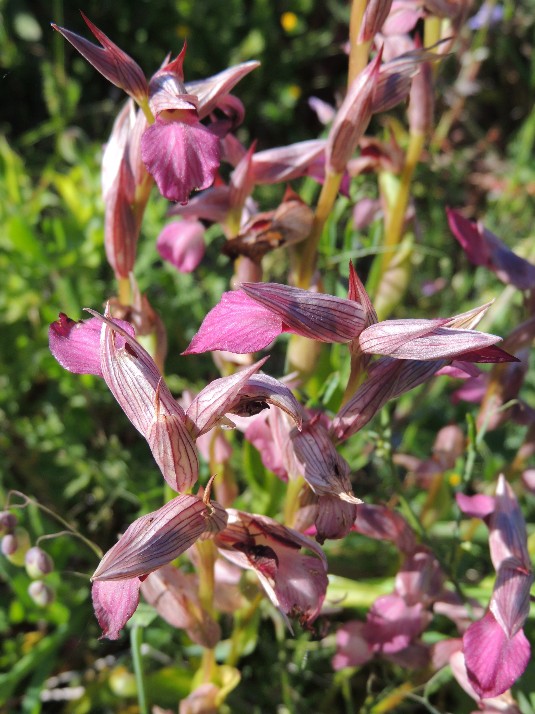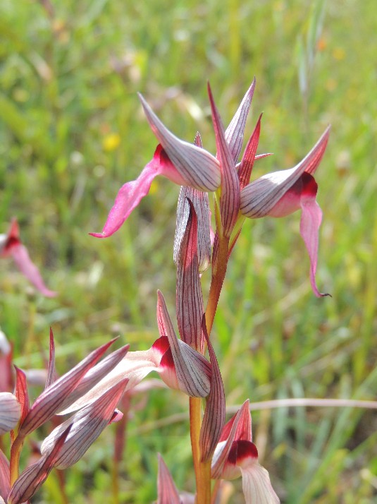 Piantina gracile , alta fino a 40 cm, che troviamo spesso in numerosi gruppi. Labello più rossiccio verso la parte esterna, mentre la parte più interna è di un colorito decisamente chiaro.Caratteristica per un ingrossamento (callosità) vicino alla fauce e con nervature longitudinali rossastre nelle brattee( foglie modificate situate alla base dei fiori , quasi a ricoprirli ). Fiori radi. Fiorisce da aprile a maggio in incolti e garighe anche in alta quota.
