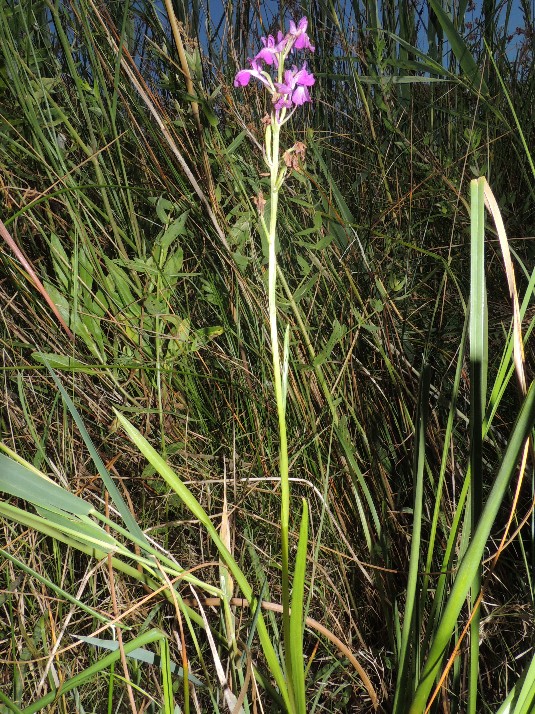 Questa orchidea, dal fusto molto allungato cresce in zone paludose e sviluppa numerosi fiori dal colore roseo o violetto.