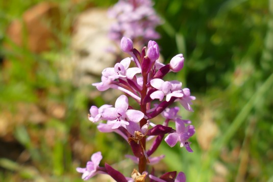 La Orchis brancifortii è una piccola piantina con fusto delicato alta poco più di 20 cm, con foglie verdastre e numerosi fiori rosa.