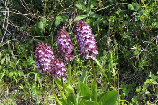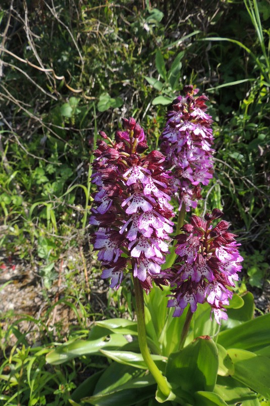 Il fusto della orchidea Orchis purpurea, è alto fino a 80 cm, è di colore verde tinteggiato color porpora con foglie basali molto lunghe e lanceolate. Numerosissimi i fiori, anche fino a 80-100 per pianta, con labelli bianchi ma punteggiati di rosa-porporino.
