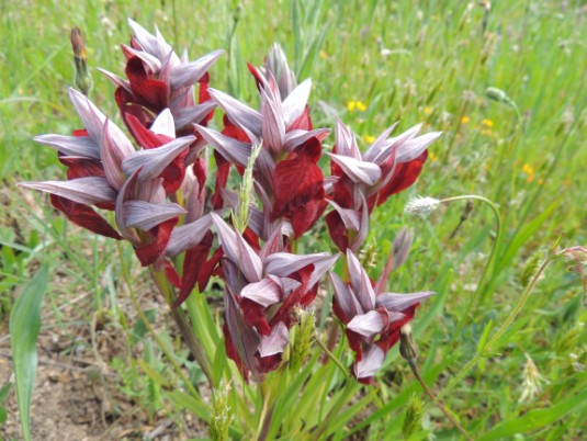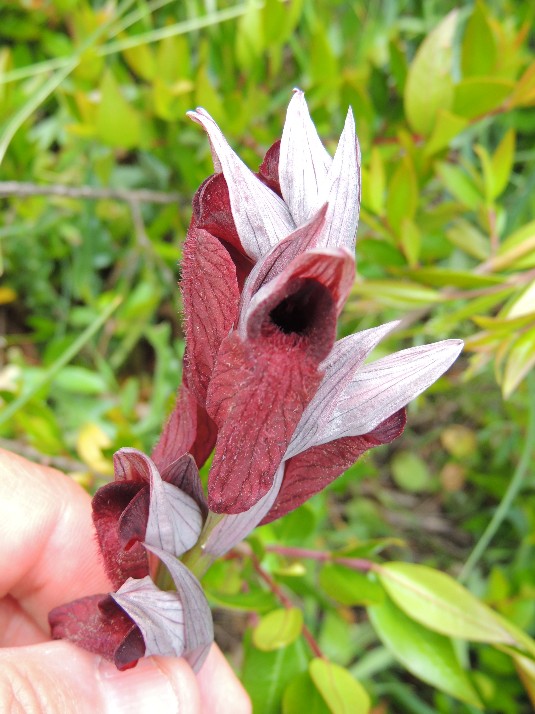 Piantina robusta, alta fino a 40 cm. , foglie prima lineari poi lanceolate.Labello lungo da 33 a 45 cm tappezzato da peli rossastri o scuri con evidenziate venature ancora più scure. Numerosi i fiori nello stesso stelo. Cresce su prati magri , sulle pinete litoranee, e su suoli più spesso silicei. Fioritura da aprile a maggio